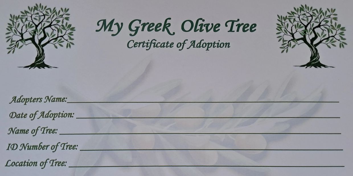 Olive tree adoption is a program that allows individuals or businesses to "adopt" an olive tree in Greece. The adopter receives a certificate of adoption for the year or years adopted, a photo of your tree with your name on the tree, and a cutting from your tree, all mailed to you. Also included a tour of the olive grove if you ever decide to visit